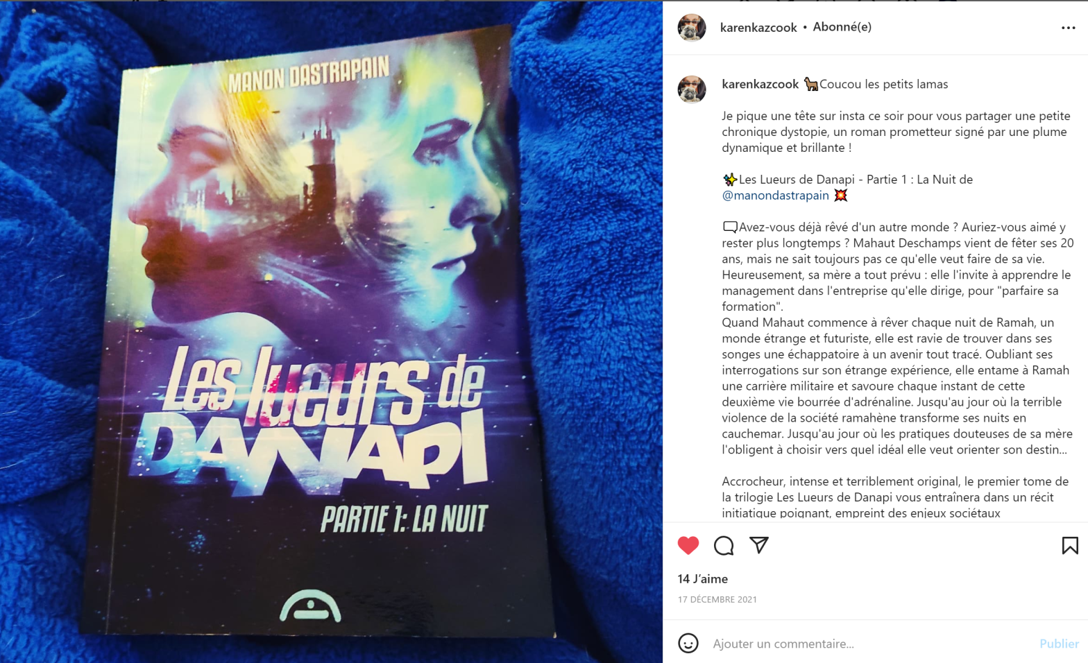 La chroniqueuse Karenkazcook de La Kaza de Papel a lu la première partie des Lueurs de Danapi et l’a visiblement bien aimée. C’est la toute première chronique que je reçois et je dois dire que ça fait beaucoup de bien à mon moral d’autrice débutante. Allez vite découvrir son avis sur Instagram, c’est par iciLire la suite « Ma toute première chronique ! »