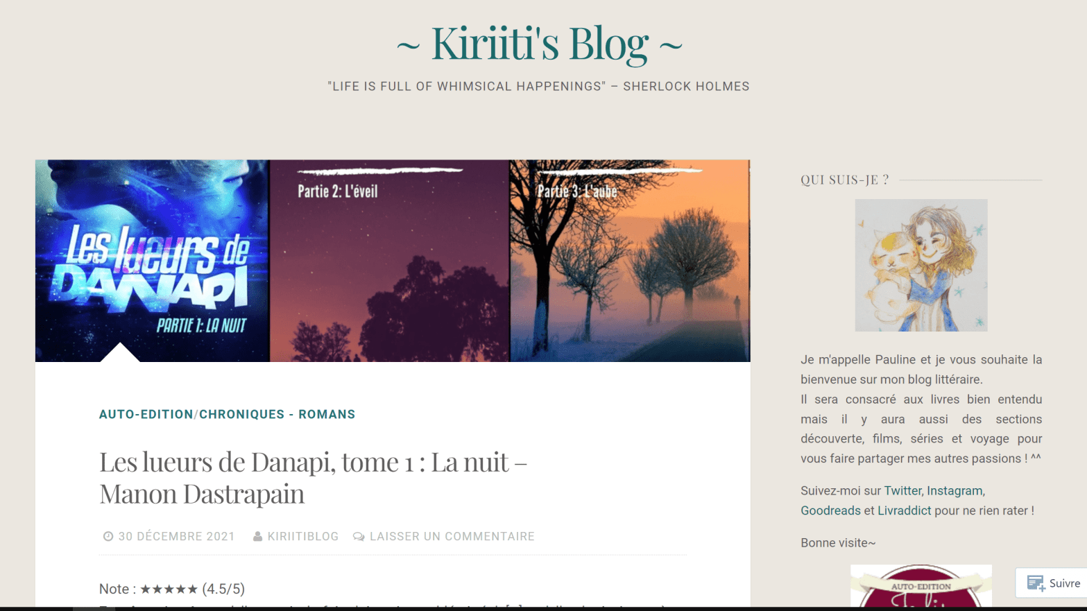 Pauline du très chouette blog Kiriiti’s Blog a lu la première partie des Lueurs de Danapi et l’a gentiment chroniquée. Envie de découvrir son avis ? C’est sur son blog, par ici !